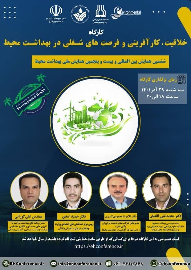 کارگاه " خلاقیت، کارآفرینی و فرصت های شغلی در بهداشت محیط " با همکاری انجمن علمی بهداشت محیط ایران و دانشگاه علوم پزشکی جندی شاپور اهواز در تاریخ 29 آذرماه 1401 از ساعت 18 الی 20 به صورت مجازی برگزار خواهد شد.