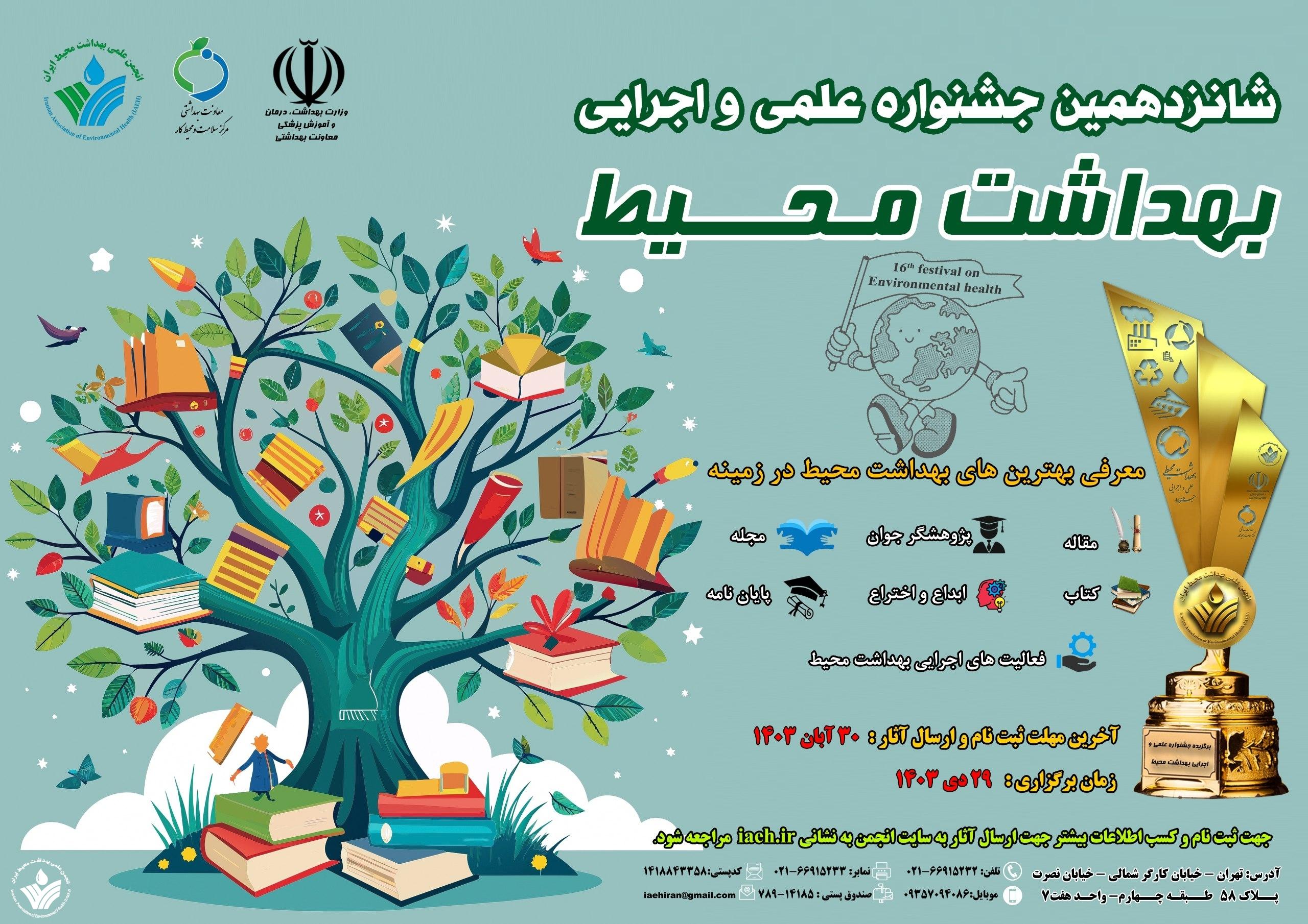 با استعانت از خداوند متعال و قدرداني از مشاركت و همراهي چشمگیر اعضاي خانواده بزرگ بهداشت محيط کشور در برگزاري موفق دوره هاي قبلي جشنواره علمي اجرایی بهداشت محيط به استحضار مي رساند همچون سنوات گذشته انجمن علمي بهداشت محيط ايران در نظر دارد به منظور كمك به ارتقاء سطح بهداشت محيط كشور و تجليل از مقام و منزلت اعضاي هيات علمي، صاحب نظران، پژوهشگران، متخصصين، كارشناسان و دانشجويان بهداشت محيط ايراني مقيم داخل و يا خارج از كشور همزمان با روز هوای پاک در 29دیماه 1403، برگزار نمايد. امید است با مشارکت هرچه بیشتر همه عزیزان، برترینها انتخاب و در مراسم نهایی جشنواره معرفی گردند. محورهاي اصلي اين جشنواره عبارتند از انتخاب و معرفي برترين هاي بهداشت محيط در زمينه هاي: